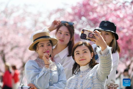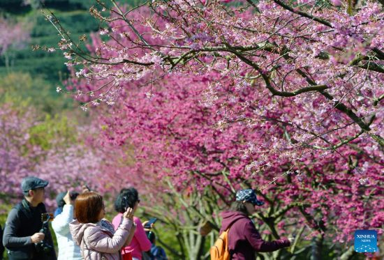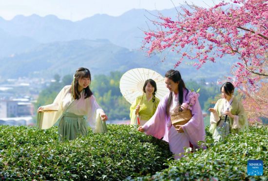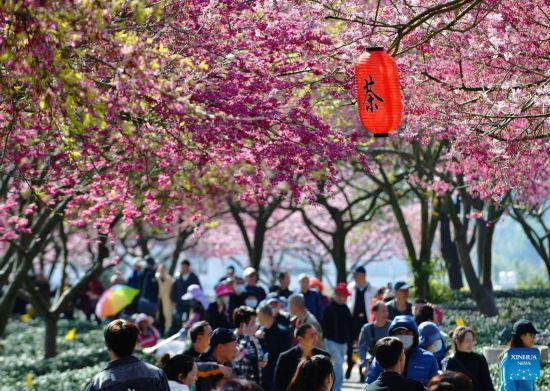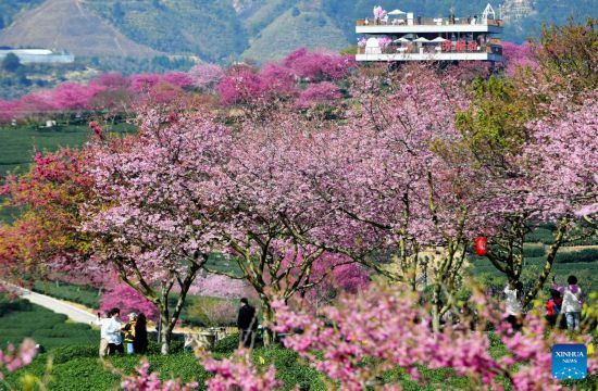 People view the scenery of cherry blossoms at a tea garden in Yongfu Town of Zhangping City, southeast China's Fujian Province, Feb. 17, 2023. (Xinhua/Wei Peiquan)