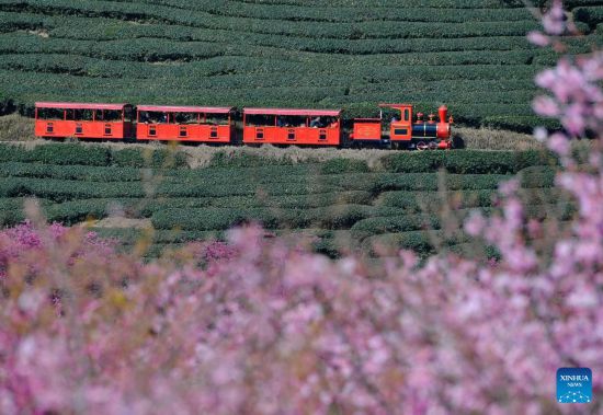 Tourists take a sightseeing train at a tea garden in Yongfu Town of Zhangping City, southeast China's Fujian Province, Feb. 17, 2023. (Xinhua/Wei Peiquan)