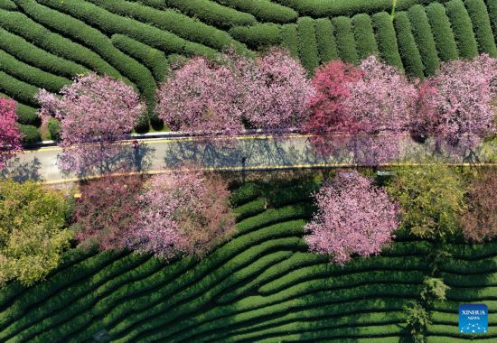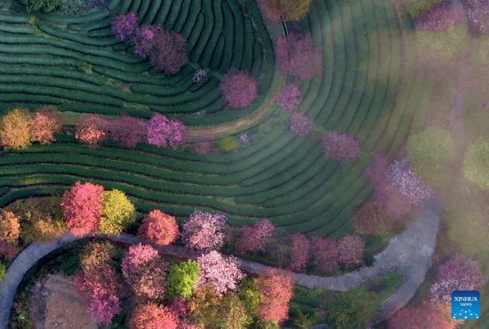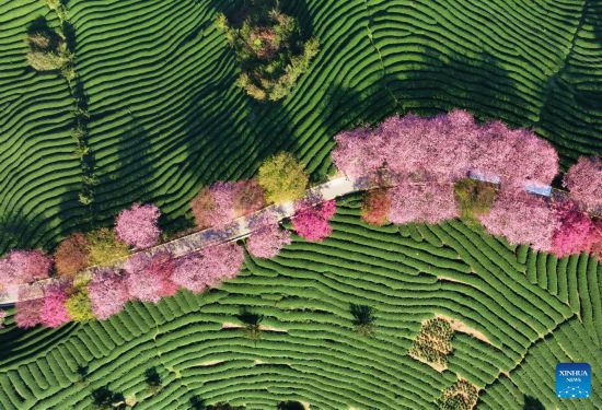 This aerial photo taken on Feb. 17, 2023 shows the scenery of cherry blossoms at a tea garden in Yongfu Town of Zhangping City, southeast China's Fujian Province. (Xinhua/Wei Peiquan)