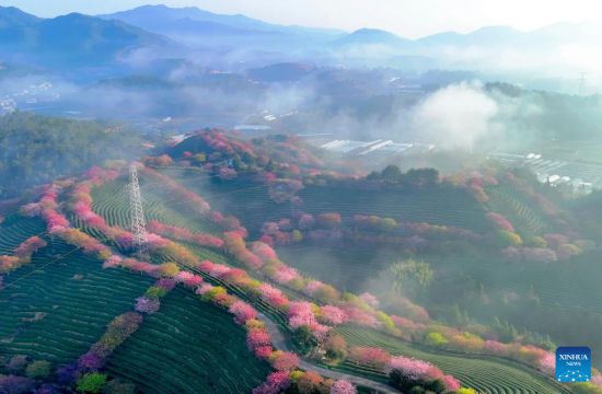 This photo taken on Feb. 17, 2023 shows the scenery of cherry blossoms at a tea garden in Yongfu Town of Zhangping City, southeast China's Fujian Province. (Xinhua/Wei Peiquan)
