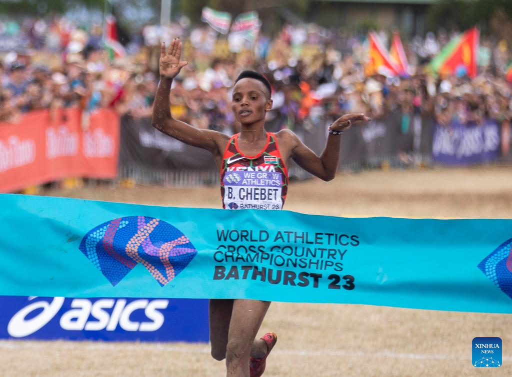 Beatrice Chebet of Kenya crosses the finishing line during the women's 10km race at the World Athletics Cross Country Championships Bathurst 23 in Bathurst, New South Wales, Australia, on Feb. 18, 2023. (Photo by Hu Jingchen/Xinhua)