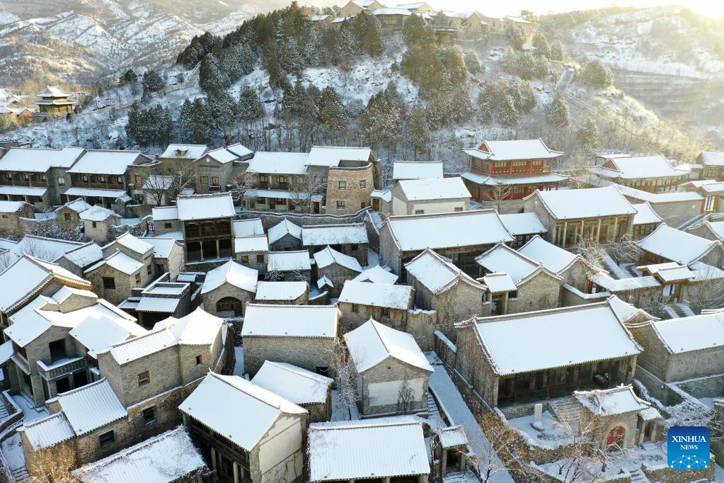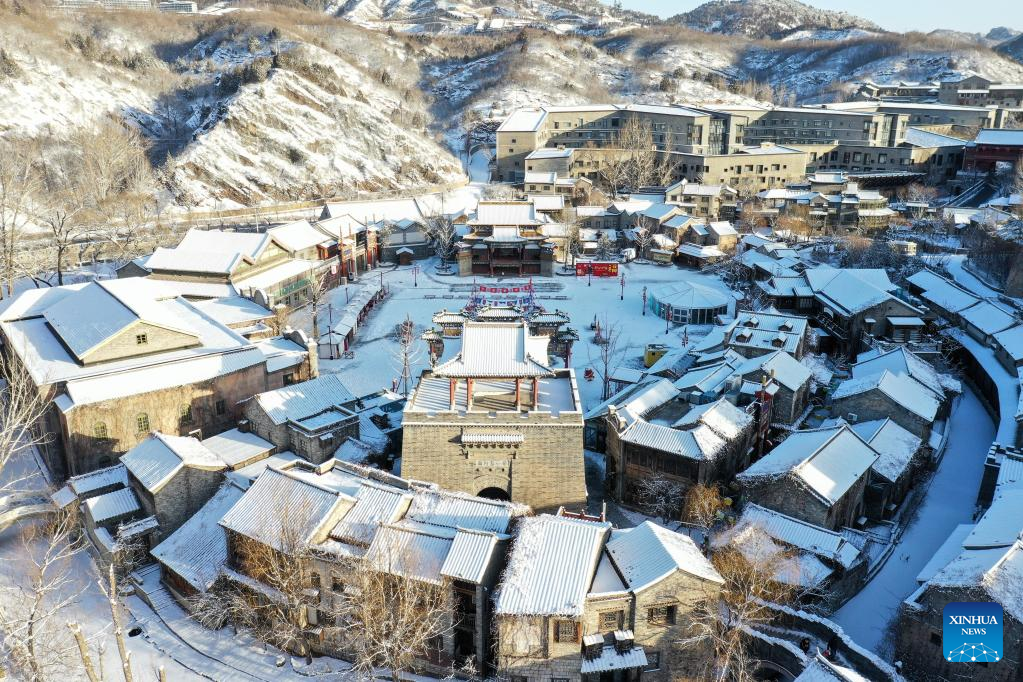 This aerial photo taken on Feb. 19, 2023 shows snow scenery of the Gubei Water Town with the Simatai section of the Great Wall in the background at sunrise in Beijing, capital of China. (Xinhua/Chen Yehua)