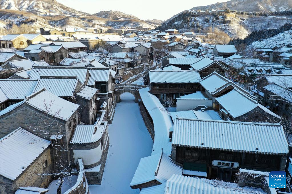 This aerial photo taken on Feb. 19, 2023 shows snow scenery of the Gubei Water Town in Beijing, capital of China. (Xinhua/Chen Yehua)