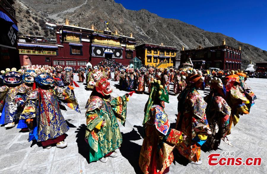 Monks perform Cham dance to greet the Tibetan New Year at the Tsurphu Monasteryin Lhasa, southwest China's Tibet Autonomous Region, Feb. 19, 2023. (Photo: China News Service/Li Lin)