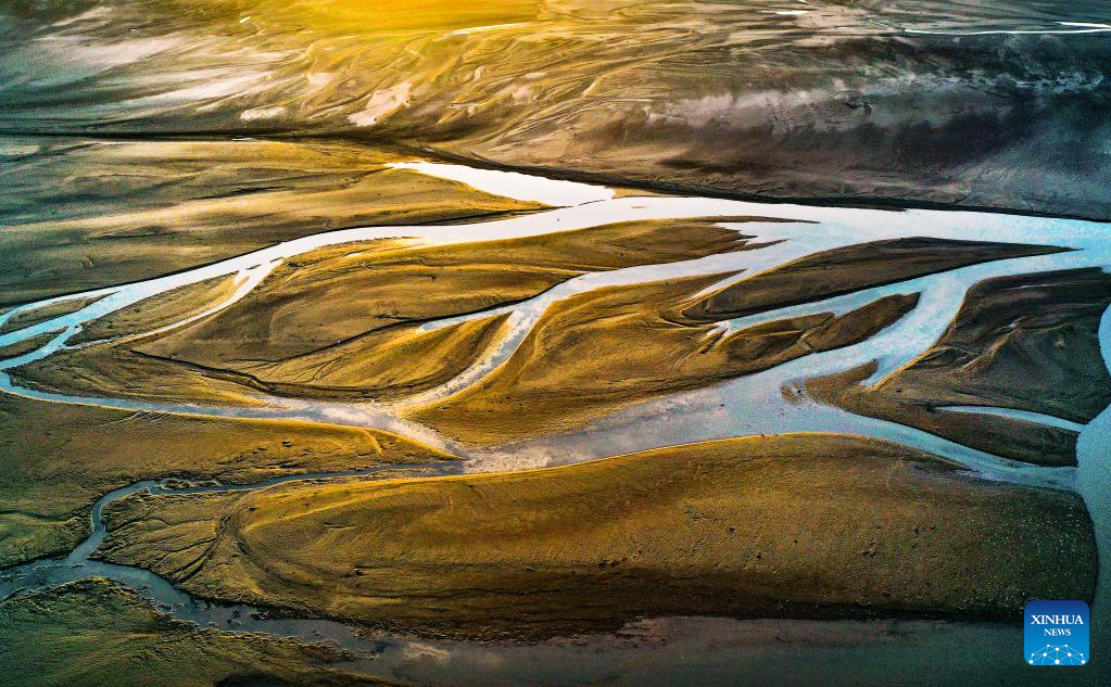 This aerial photo taken on Feb. 19, 2023 shows the scenery of Heyang section of the Yellow River in Weinan City, northwest China's Shaanxi Province. (Photo by Zhao Xiaogang/Xinhua)