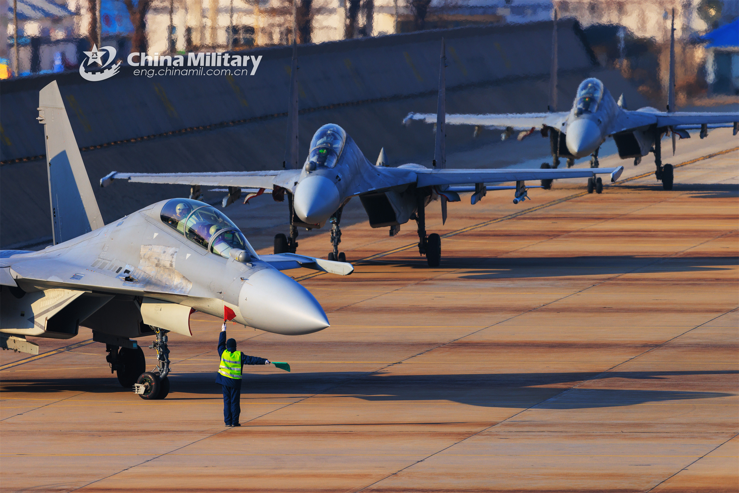 Fighter jets attached to an aviation regiment of the PLA Air Force taxi on the runway to get ready for training during a recent round-the-clock training exercise. (eng.chinamil.com.cn/Photo by Xu Chentong)