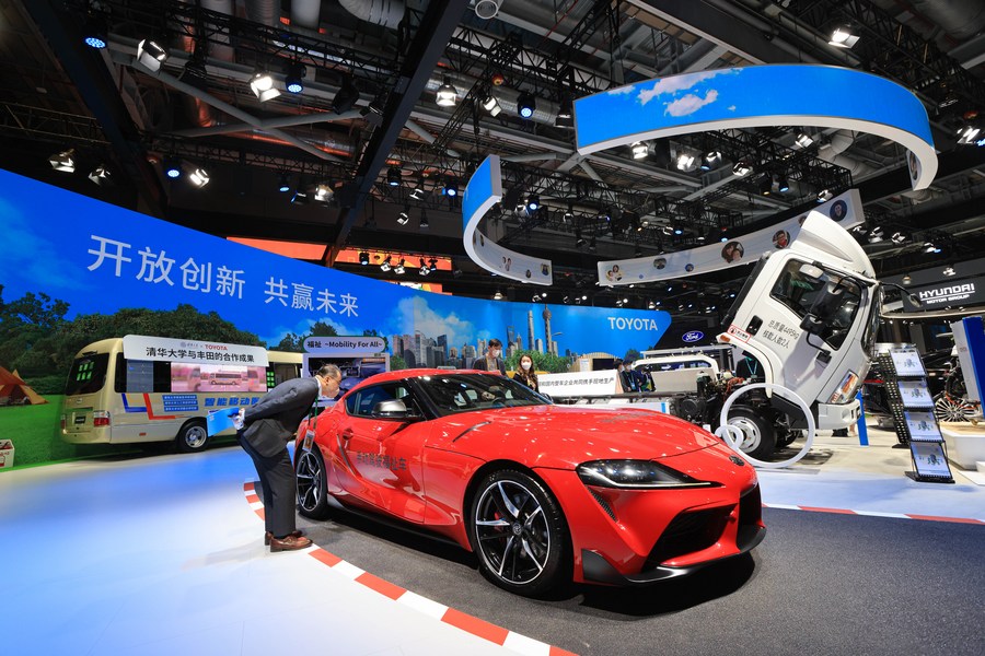 A visitor looks at a car at the booth of Toyota at the fifth China International Import Expo (CIIE) in east China's Shanghai, Nov. 6, 2022.(Xinhua/Li Jing)