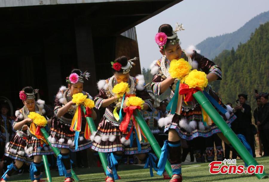 Villagers of Miao ethnic group dance with Lusheng, a reed-pipe wind instrument, to celebrate Er Yue Er (Dragon Head Raising Day) in Dongtou town, Rongshui Miao Autonomous County, south China's Guangxi Zhuang Autonomous Region, Feb. 20, 2023. (Photo: China News Service/Long Linzhi)
