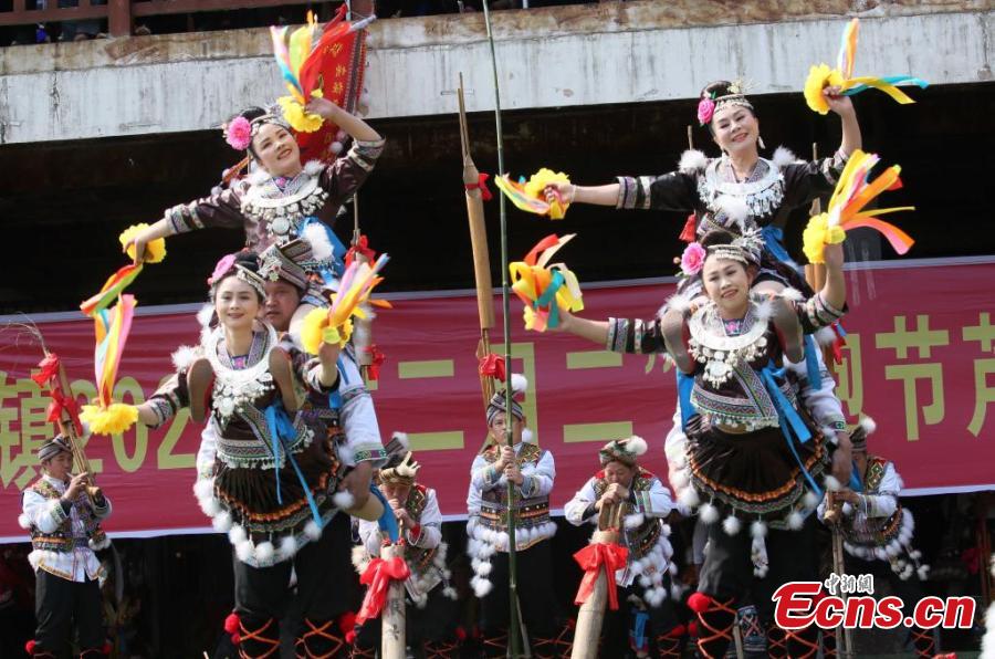 Villagers of Miao ethnic group dance with Lusheng, a reed-pipe wind instrument, to celebrate Er Yue Er (Dragon Head Raising Day) in Dongtou town, Rongshui Miao Autonomous County, south China's Guangxi Zhuang Autonomous Region, Feb. 20, 2023. (Photo: China News Service/Long Linzhi)