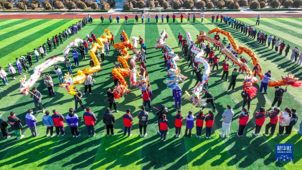 Aerial photo taken on Feb. 20 shows primary school children performing a dragon dance to celebrate the Longtaitou Festival in Zunhua, north China’s Hebei Province. (Xinhua/Liu Mancang)