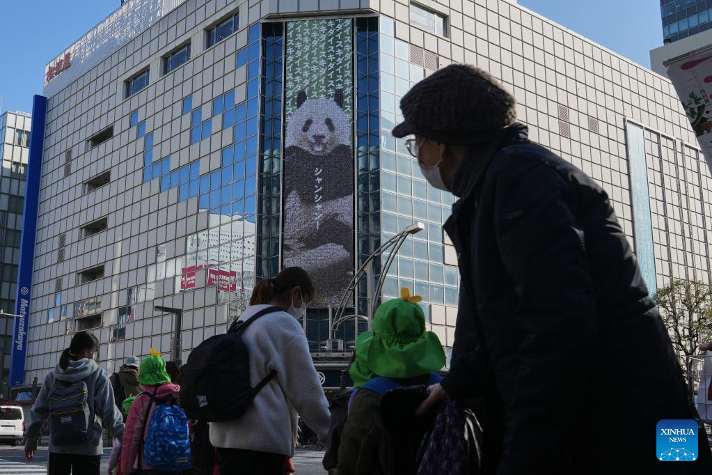 An 18-meter-high poster of giant panda Xiang Xiang is seen outside a shopping mall in Tokyo, Japan, Feb. 17, 2023. Xiang Xiang will be sent home to China on Tuesday. (Xinhua/Zhang Xiaoyu)