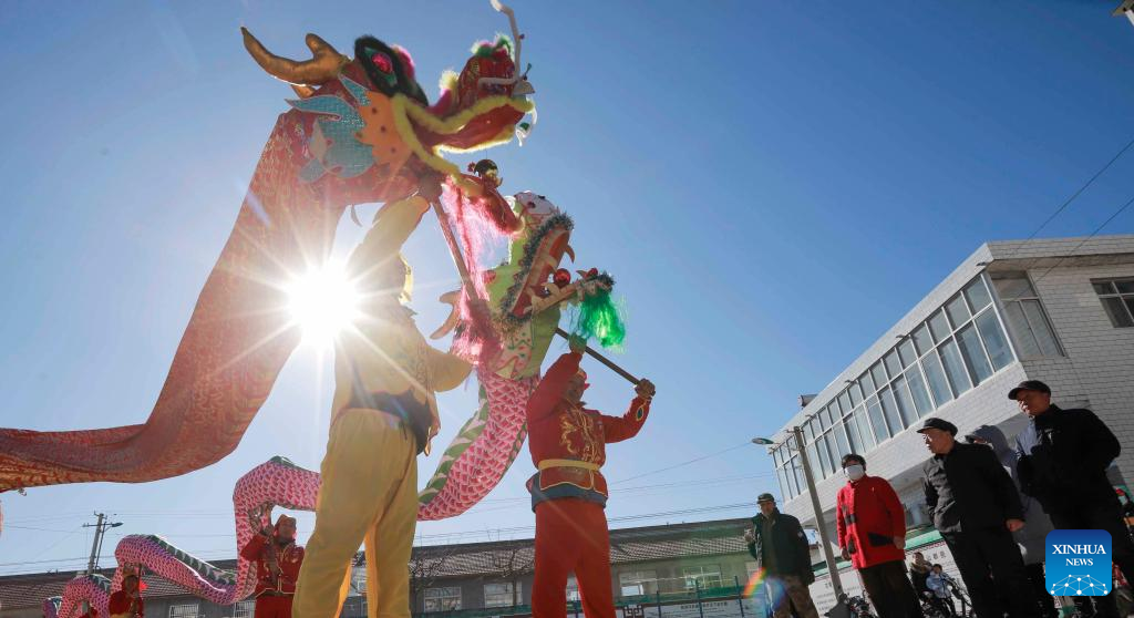 Folk artists perform dragon dance to celebrate the Longtaitou Day in Tiechang Village, Zunhua City, north China's Hebei Province, Feb. 21, 2023. Literally meaning "dragon raises head", the day of Longtaitou, the second day of the second lunar month, falls on Feb. 21 this year. (Photo by Liu Mancang/Xinhua)
