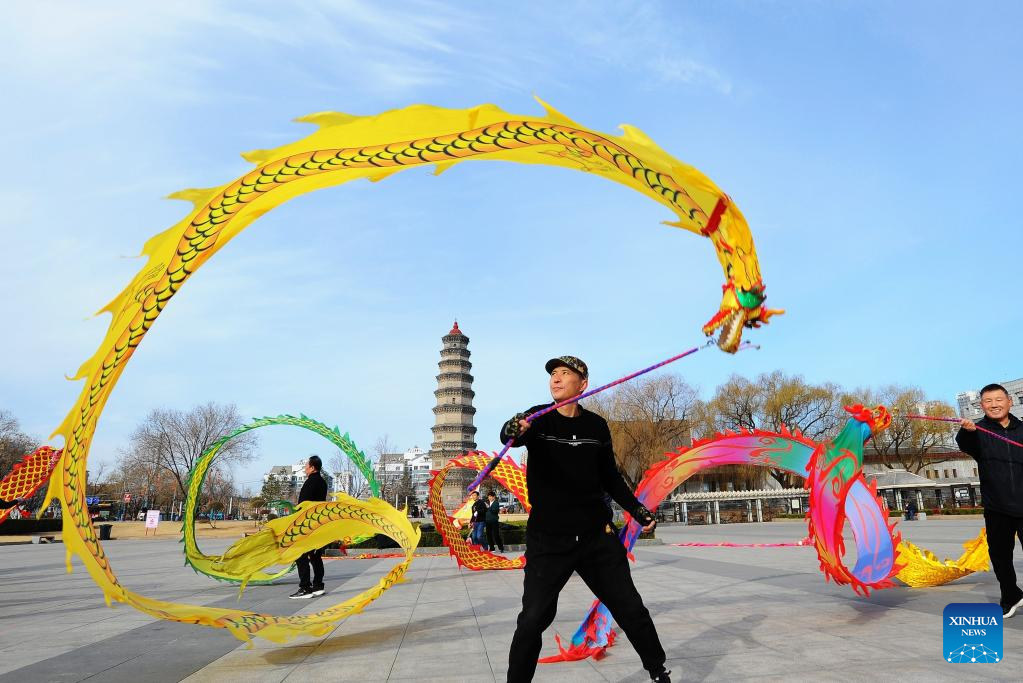 People perform to greet the Longtaitou Day on a square in Tengzhou City, east China's Shandong Province, Feb. 21, 2023. Literally meaning "dragon raises head", the day of Longtaitou, the second day of the second lunar month, falls on Feb. 21 this year. (Photo by Li Zhijun/Xinhua)