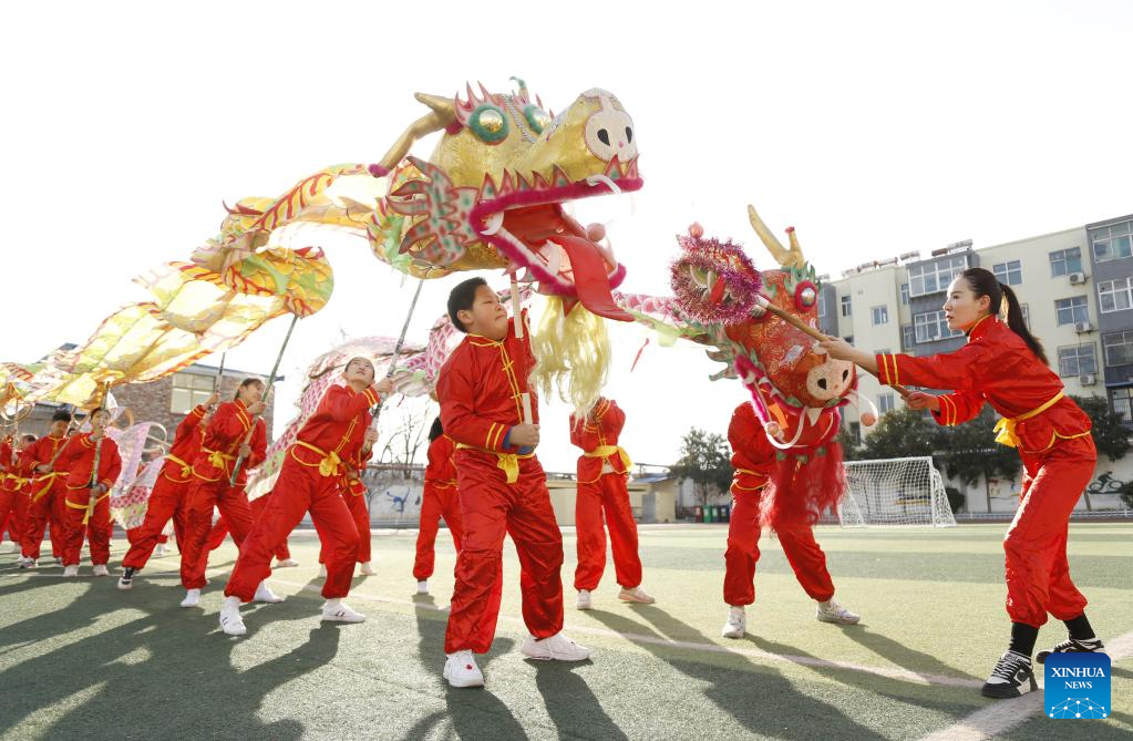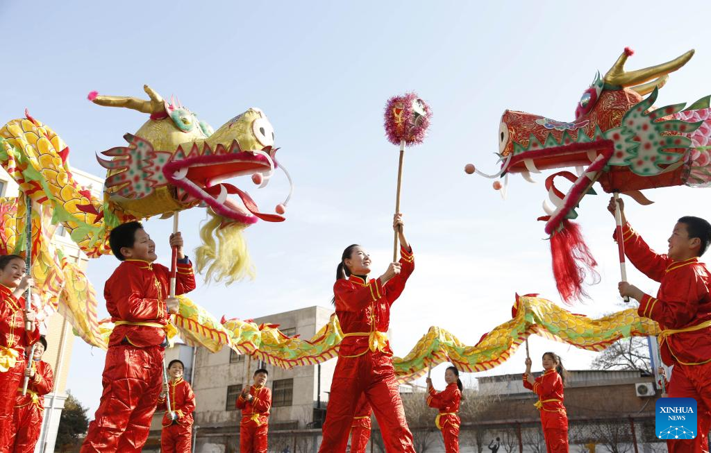Pupils perform dragon dance to greet the Longtaitou Day at a primary school in Xingtai City, north China's Hebei Province, Feb. 21, 2023. Literally meaning "dragon raises head", the day of Longtaitou, the second day of the second lunar month, falls on Feb. 21 this year. (Photo by Zhang Chi/Xinhua)