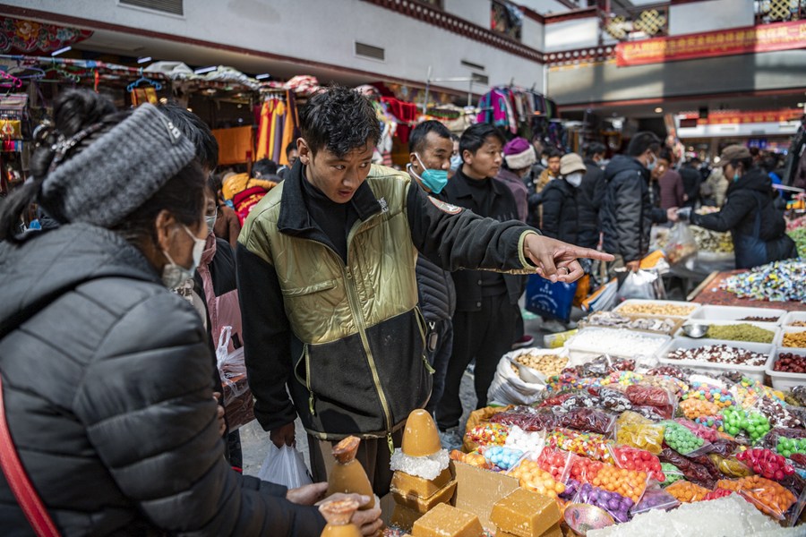 Tashi Phuntsog does festive shopping at Barkhor Mall in Lhasa, southwest China's Tibet Autonomous Region, Feb. 18, 2023. (Xinhua/Sun Fei)