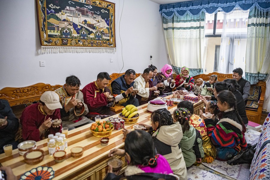 Tsewang and her family enjoy "gutu," a kind of soup made of flour and a traditional dish for the night of the 29th of the 12th month in the Tibetan calendar, at the relocation site in Singpori, southwest China's Tibet Autonomous Region, Feb. 19, 2023. (Xinhua/Sun Fei)