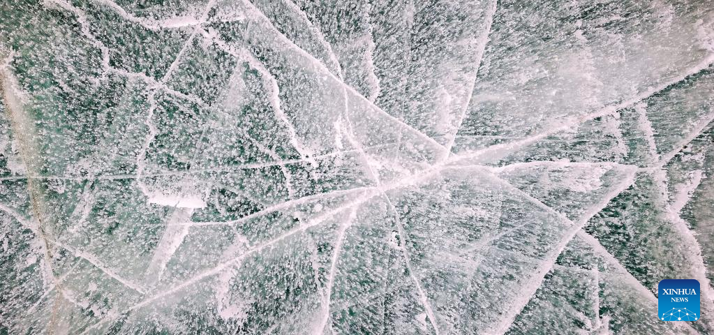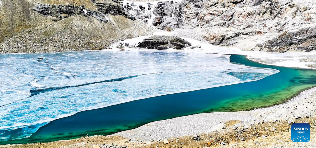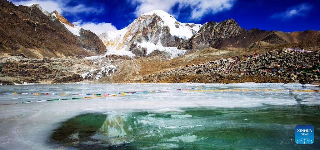 This photo taken with a mobile phone on Feb. 20, 2023 shows a view of an icy lake at the foot of Mount Qungmknag in Nyemo County of Lhasa, southwest China's Tibet Autonomous Region. (Xinhua/Shen Hongbing)