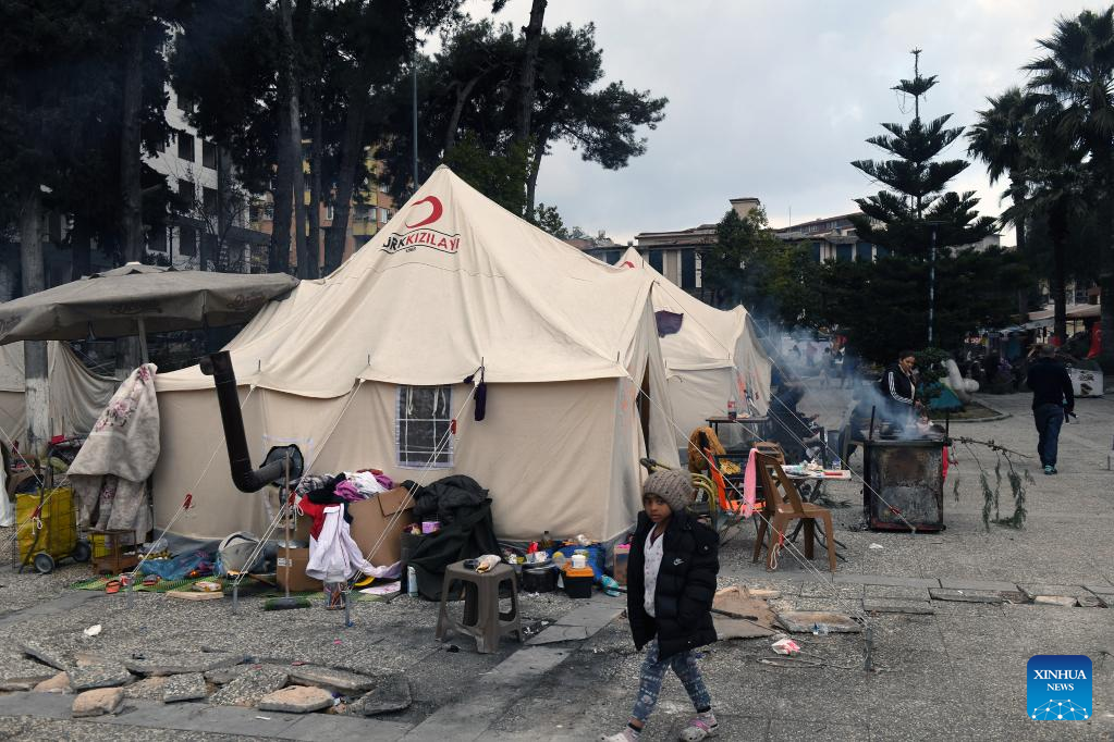 A child walks past tents in the quake-hit Hatay, Türkiye, on Feb. 21, 2023. At least six people were killed and 294 others injured in Monday's new earthquakes that struck Türkiye's southern province of Hatay, the disaster agency said Tuesday. The twin earthquakes, measuring 6.4- and 5.8-magnitude respectively, came two weeks after the massive ones rocked the same region on Feb. 6 that have killed more than 41,000. (Photo by Mustafa Kaya/Xinhua)