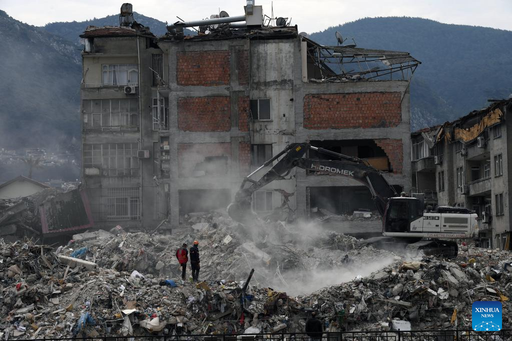 An excavator clears debris in the quake-hit Hatay, Türkiye, on Feb. 21, 2023. At least six people were killed and 294 others injured in Monday's new earthquakes that struck Türkiye's southern province of Hatay, the disaster agency said Tuesday. The twin earthquakes, measuring 6.4- and 5.8-magnitude respectively, came two weeks after the massive ones rocked the same region on Feb. 6 that have killed more than 41,000. (Photo by Mustafa Kaya/Xinhua)