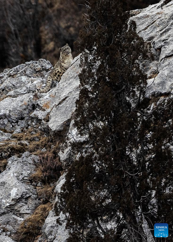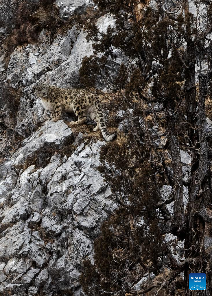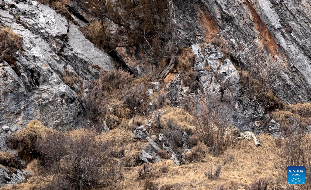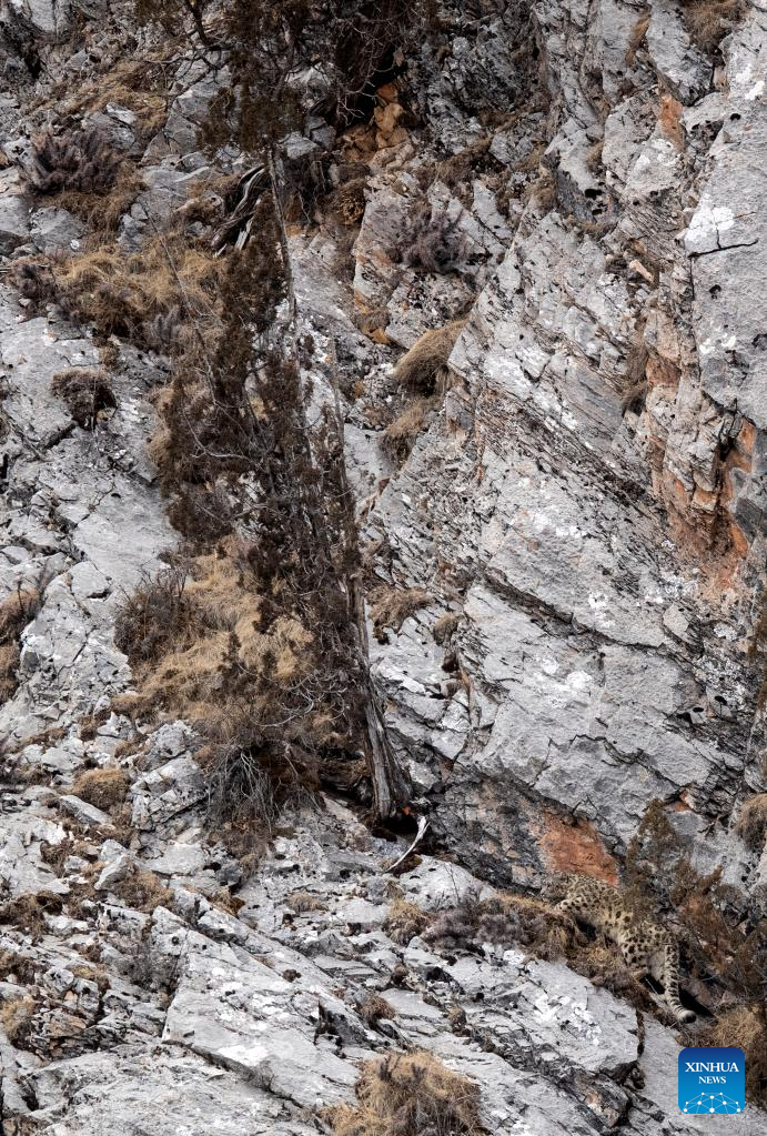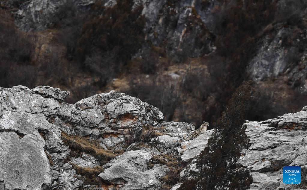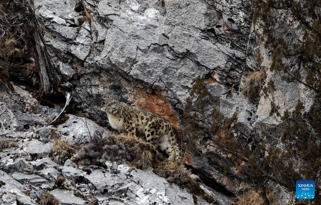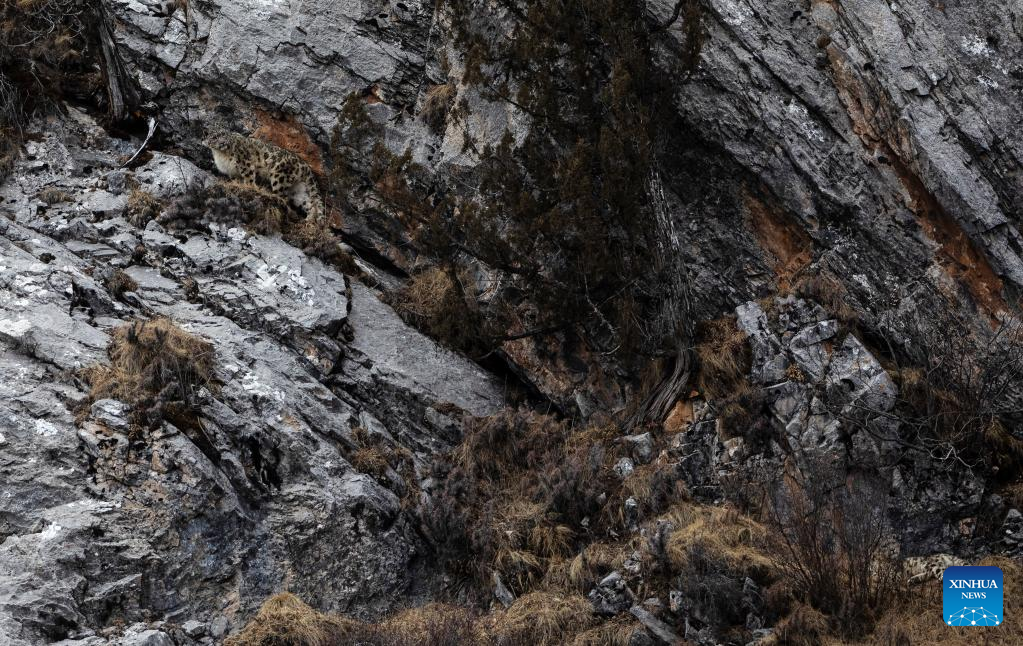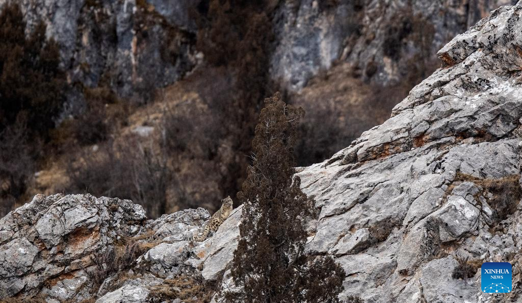 A snow leopard is pictured in a canyon in Zadoi County of Yushu Tibetan Autonomous Prefecture, northwest China's Qinghai Province, Feb. 21, 2023. (Xinhua/Zhang Hongxiang)