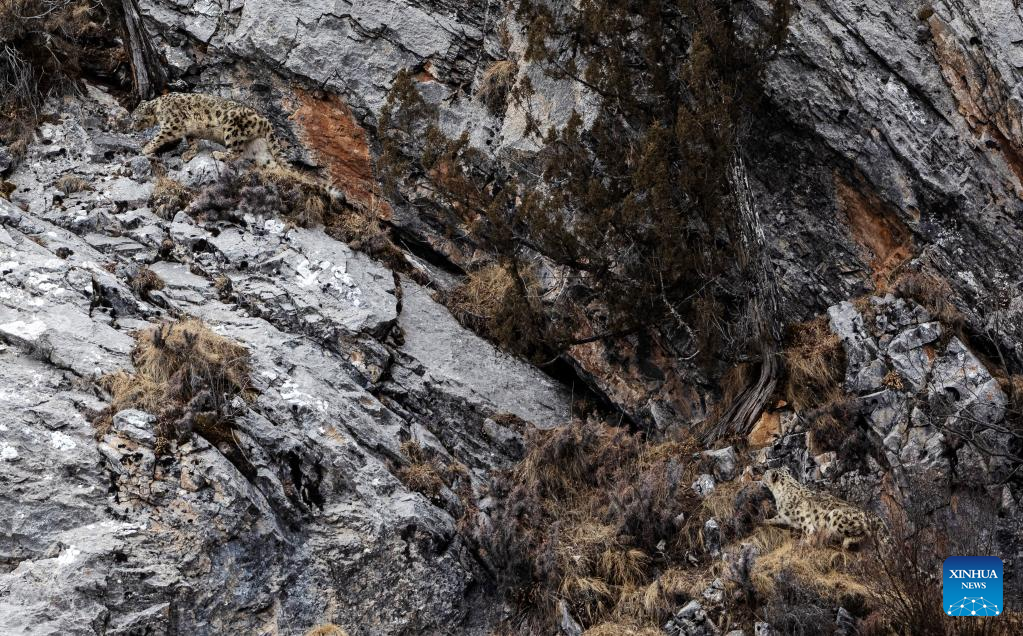 Two snow leopards are pictured in a canyon in Zadoi County of Yushu Tibetan Autonomous Prefecture, northwest China's Qinghai Province, Feb. 21, 2023. (Xinhua/Fei Maohua)