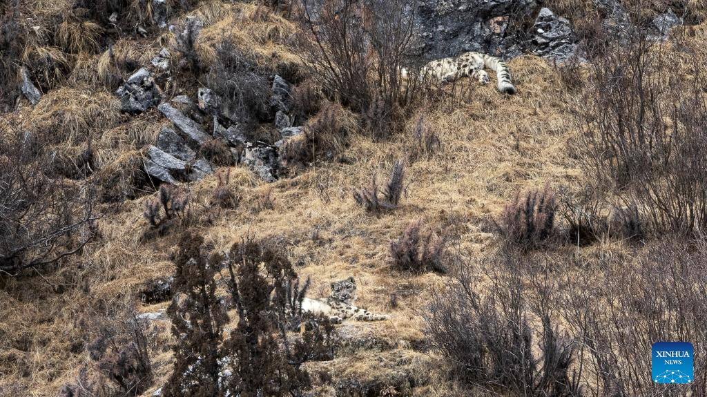 Two snow leopards are pictured in a canyon in Zadoi County of Yushu Tibetan Autonomous Prefecture, northwest China's Qinghai Province, Feb. 21, 2023. (Xinhua/Zhang Hongxiang)