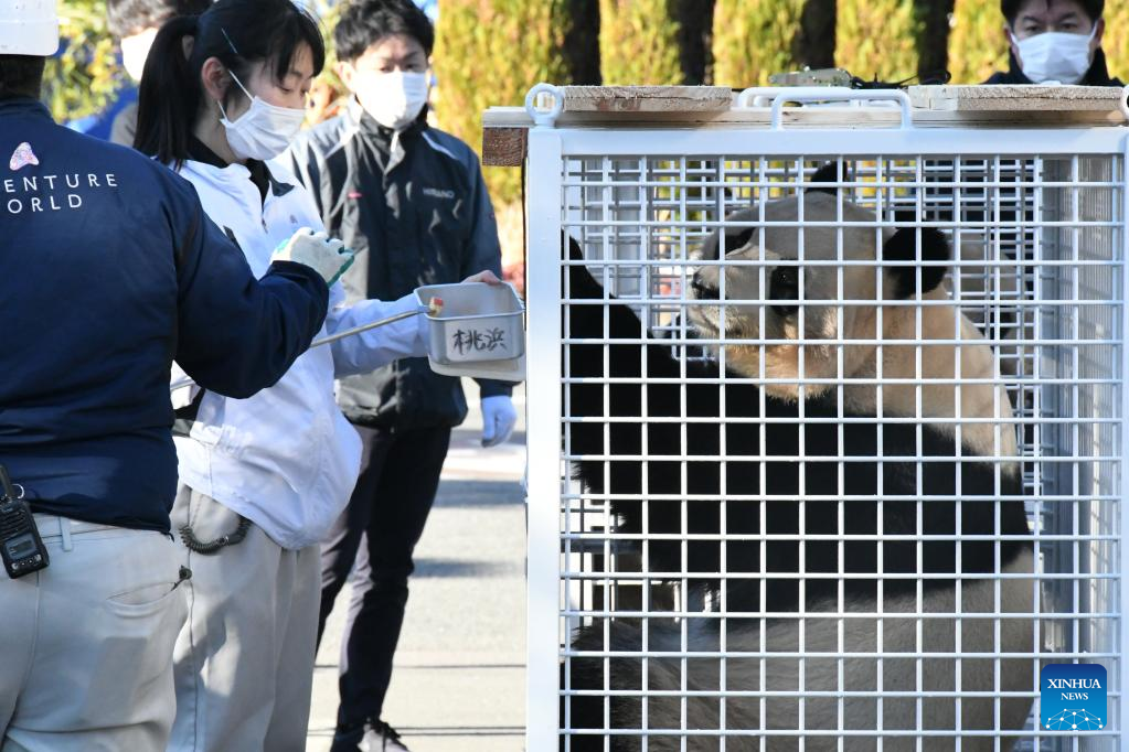 A staff member feeds giant panda Touhin with apples at Adventure World in Shirahama, Wakayama prefecture, Japan, Feb. 22, 2023.