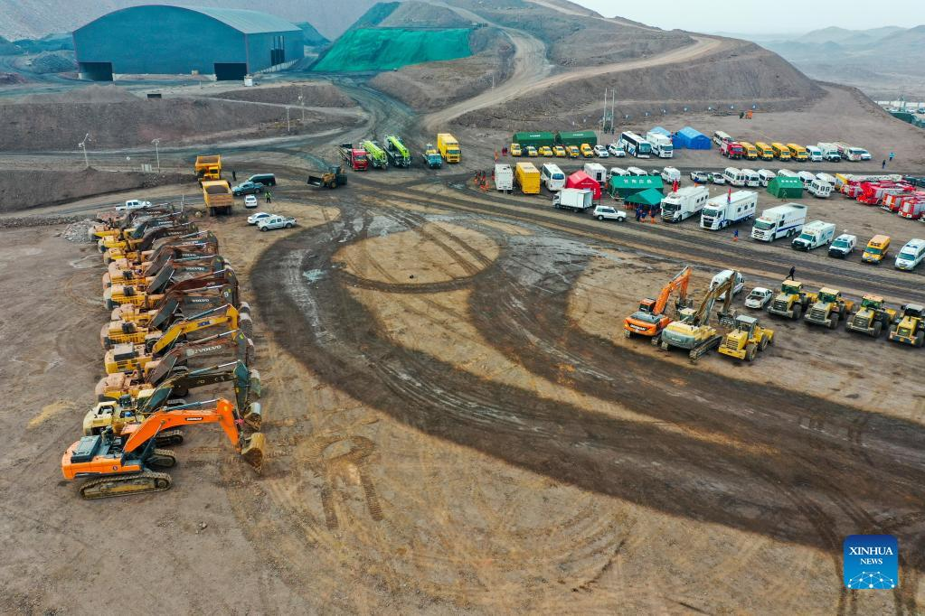 This aerial photo taken on Feb. 23, 2023 shows rescue vehicles near the site of a collapsed coal mine in Alxa League, north China's Inner Mongolia Autonomous Region. The landslide occurred at the rescue site at around 6 p.m. Wednesday, according to the rescue headquarters. As of 6 a.m. Thursday, more than 900 people had rushed to the site for rescue operations after an open-pit mine collapsed in Alxa Left Banner at around 1 p.m. Wednesday, resulting in two deaths, six injuries, and 53 people missing. (Xinhua/Lian Zhen)