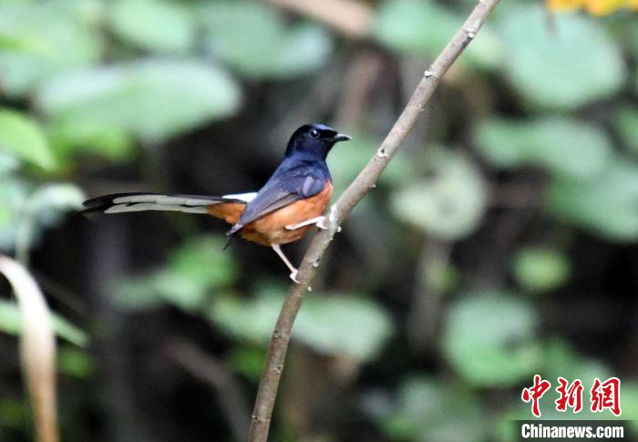 A white-rumped shama perches on a tree branch in Nonggang village, Longzhou county, south China’s Guangxi Zhuang Autonomous Region. (Chinanews.com/Jiang Xuelin)
