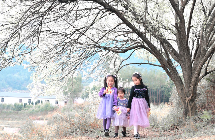 Visitors pose for pictures with pear flowers in Bancheng township, Qinbei district, Qinzhou, south China's Guangxi Zhuang Autonomous Region. (Photo/Zhang Xiaodong)