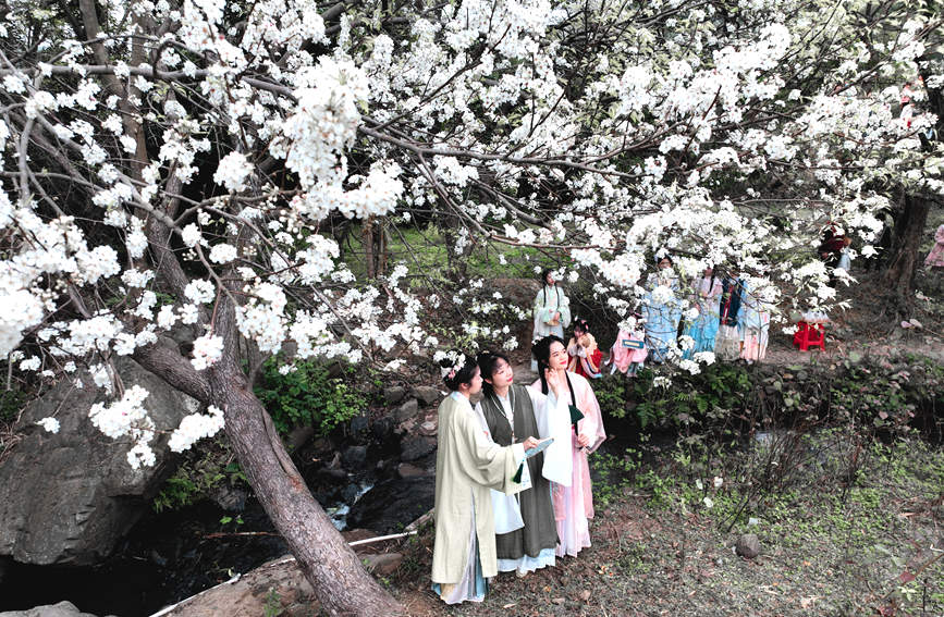 Visitors pose for pictures with pear flowers in Bancheng township, Qinbei district, Qinzhou, south China's Guangxi Zhuang Autonomous Region. (Photo/Zhang Xiaodong)