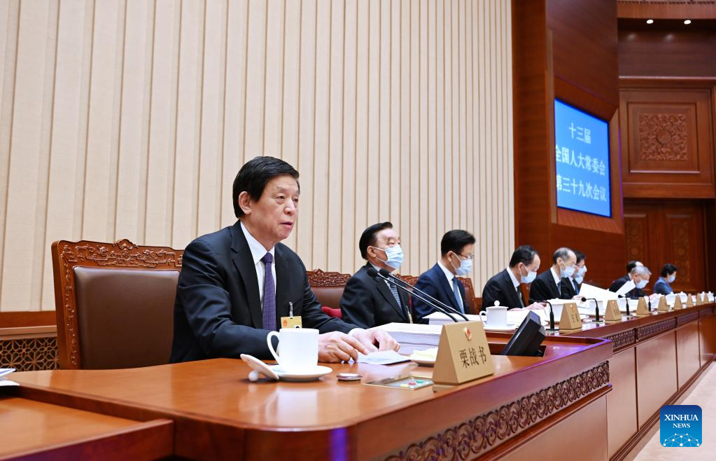 Li Zhanshu, chairman of the National People's Congress (NPC) Standing Committee, presides over the first plenary meeting of the 39th session of the 13th NPC Standing Committee at the Great Hall of the People in Beijing, capital of China, Feb. 23, 2023. (Xinhua/Zhang Ling)