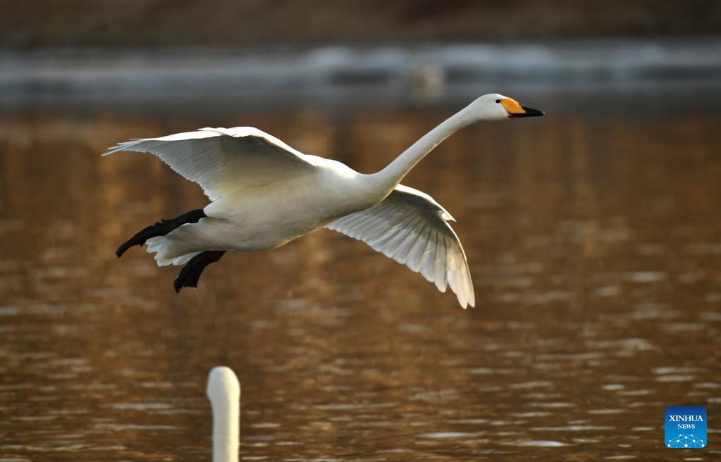 Swans fly in Hongcun Village, Bajiazi Township, Beipiao of northeast China's Liaoning Province, Feb. 21, 2023.