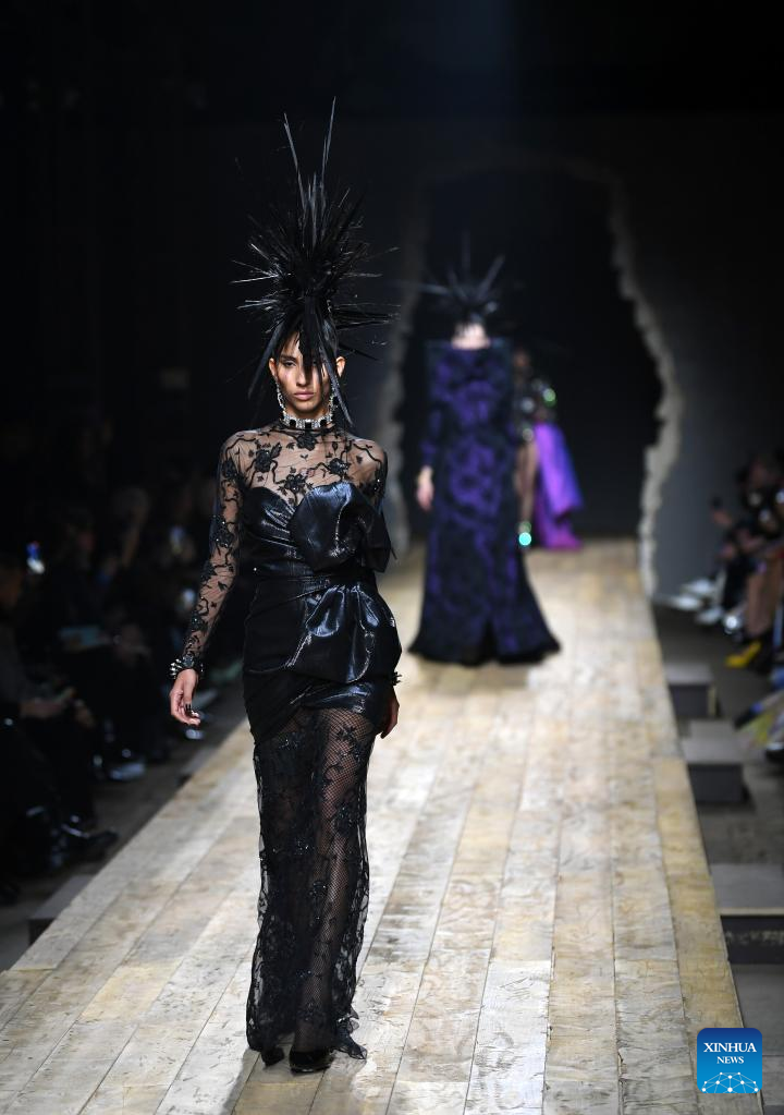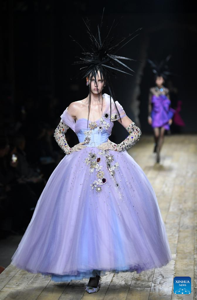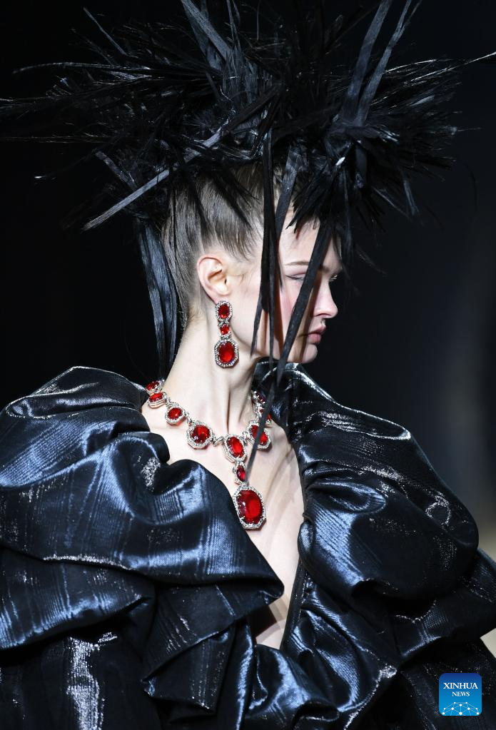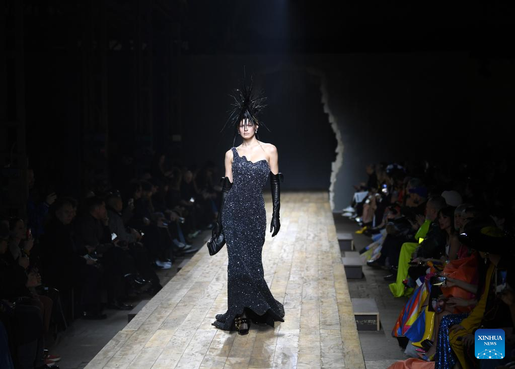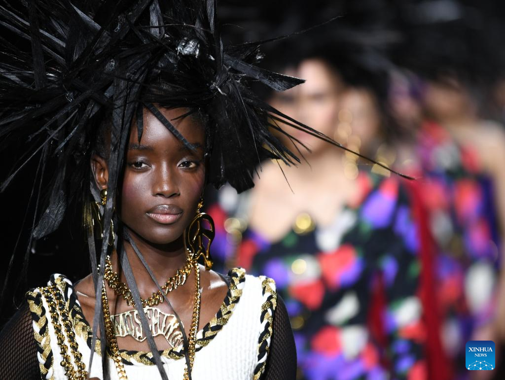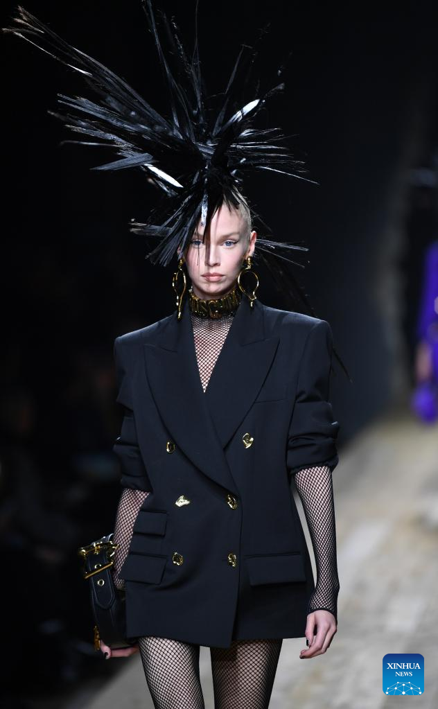 A model presents a creation from Moschino women's Fall/Winter 2023/2024 collection during Milan Fashion Week in Milan, Italy, on Feb. 23, 2023. (Xinhua/Jin Mamengni)