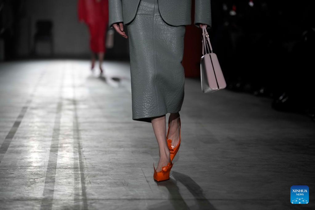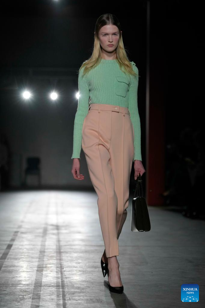A model presents a creation from Prada women's Fall/Winter 2023/2024 collection during Milan Fashion Week in Milan, Italy, on Feb. 23, 2023. (Str/Xinhua)