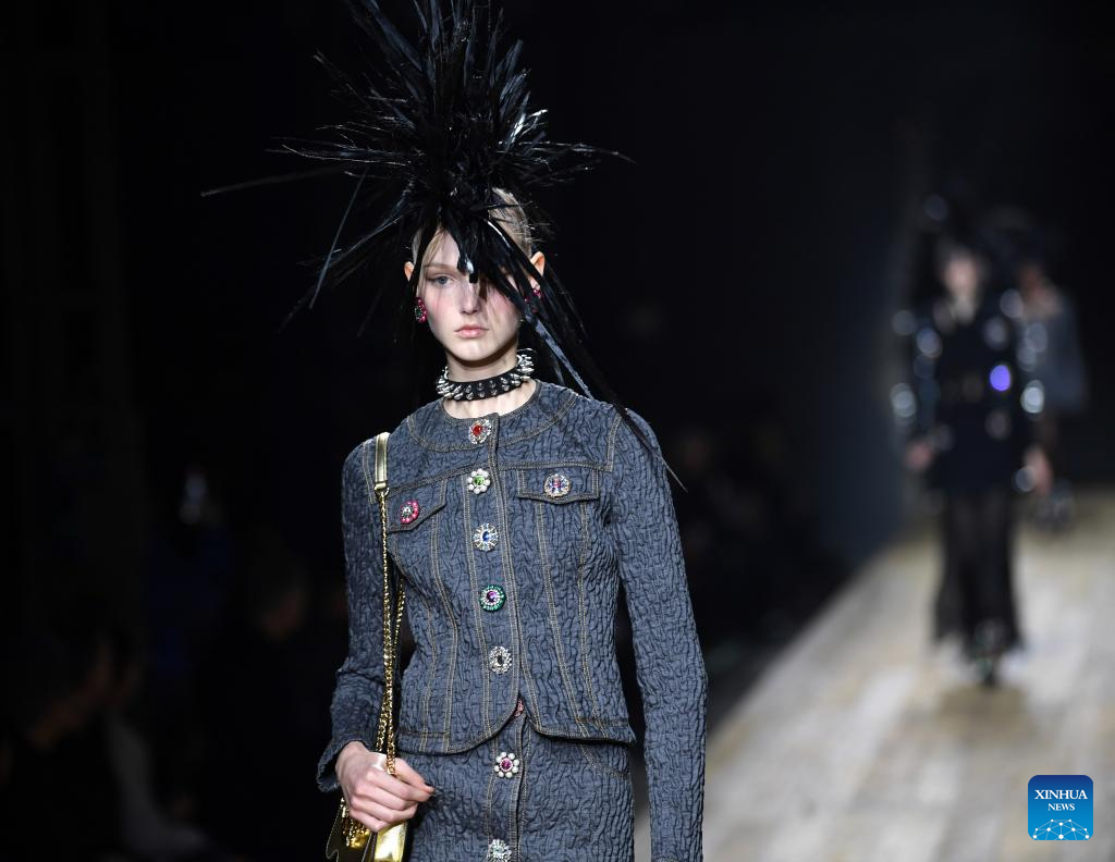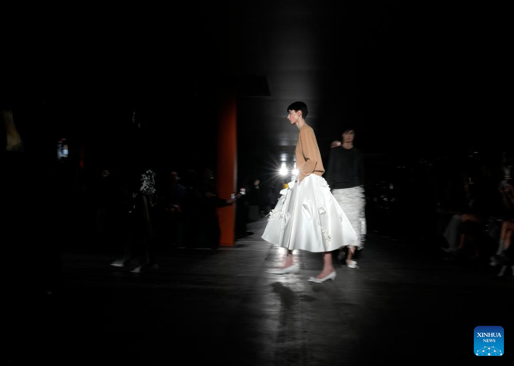 Models present creations from Prada women's Fall/Winter 2023/2024 collection during Milan Fashion Week in Milan, Italy, on Feb. 23, 2023. (Str/Xinhua)