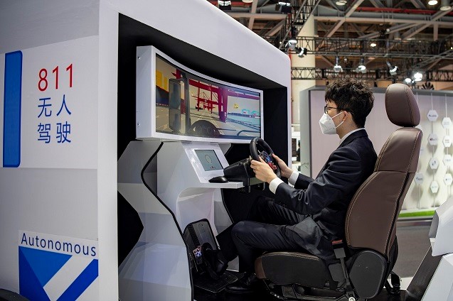 A man drives on a virtual driving simulator at the Global Digital Trade Expo held in Hangzhou, east China's Zhejiang province between Dec. 11 and 14, 2022. (People's Daily Online/Hu Xiaofei)