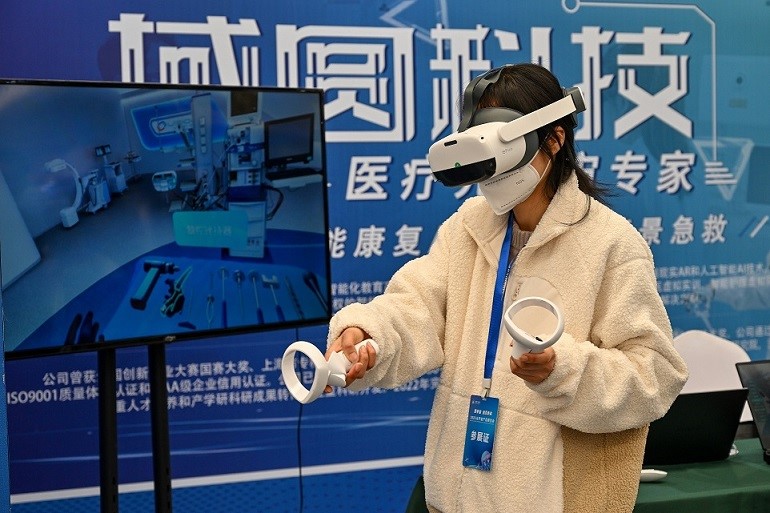 An employee of an exhibitor shows a virtual reality product at a metaverse conference and exhibition held in Kunshan, east China's Jiangsu province, Feb. 15, 2023. (People's Daily Online/Zhang Congyu)