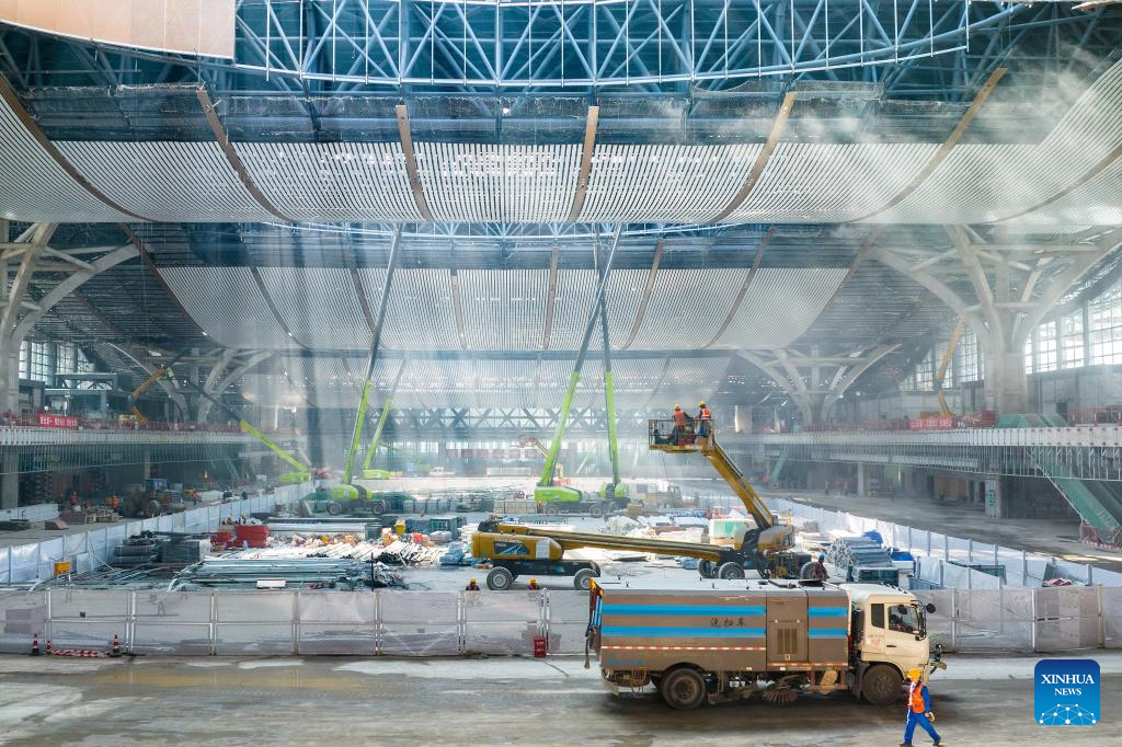 Workers install the suspended ceiling at the waiting hall of Xiamen North Railway Station of the new Fuzhou-Xiamen high-speed railway in Xiamen, southeast China's Fujian Province, Feb. 23, 2023. The 277-km railway runs along southeast China's coastline and crosses over three major bays on gigantic bridges. It's the country's first sea-crossing high-speed railway. With a designed speed of 350 km per hour and eight stations along the route, it is expected to slash the travel time between the two cities to just one hour. (Xinhua)