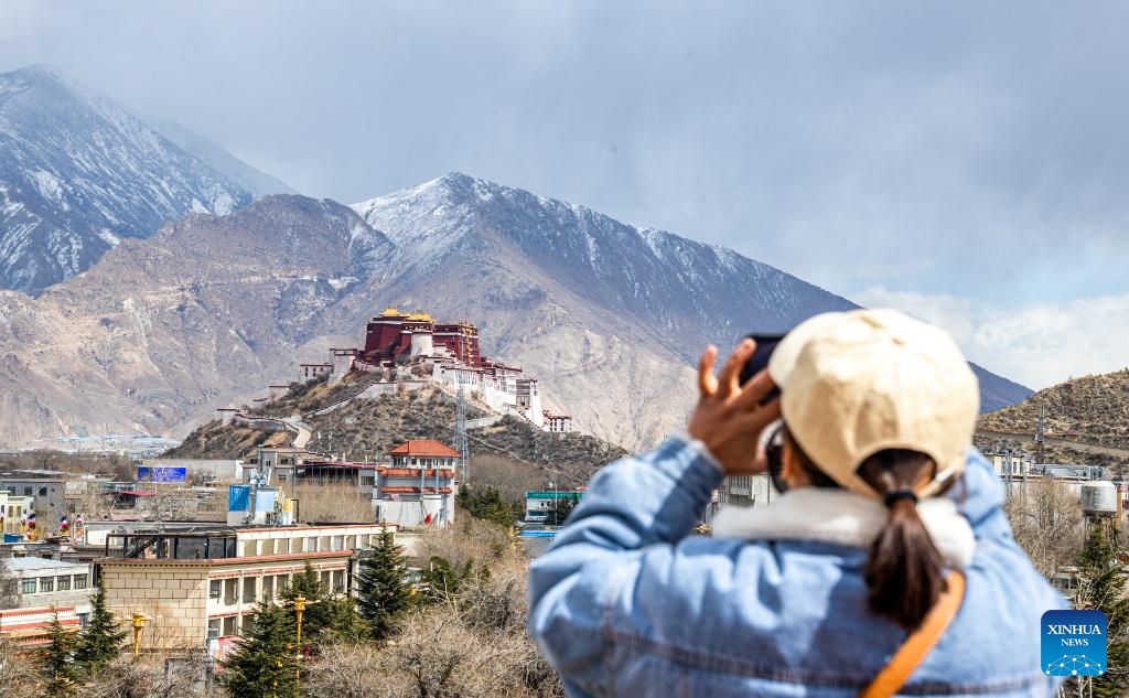 A tourist takes photos of the Potala Palace after a snowfall in Lhasa, southwest China's Tibet Autonomous Region, Feb. 24, 2023. (Photo by Tenzin Nyida/Xinhua)
