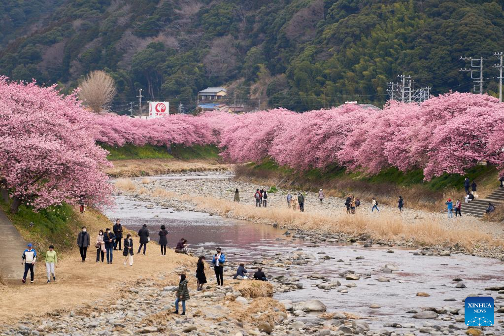 People enjoy early-blooming Kawazu cherry blossoms in Kawazu of Shizuoka Prefecture, Japan, Feb. 24, 2023. (Xinhua/Zhang Xiaoyu)