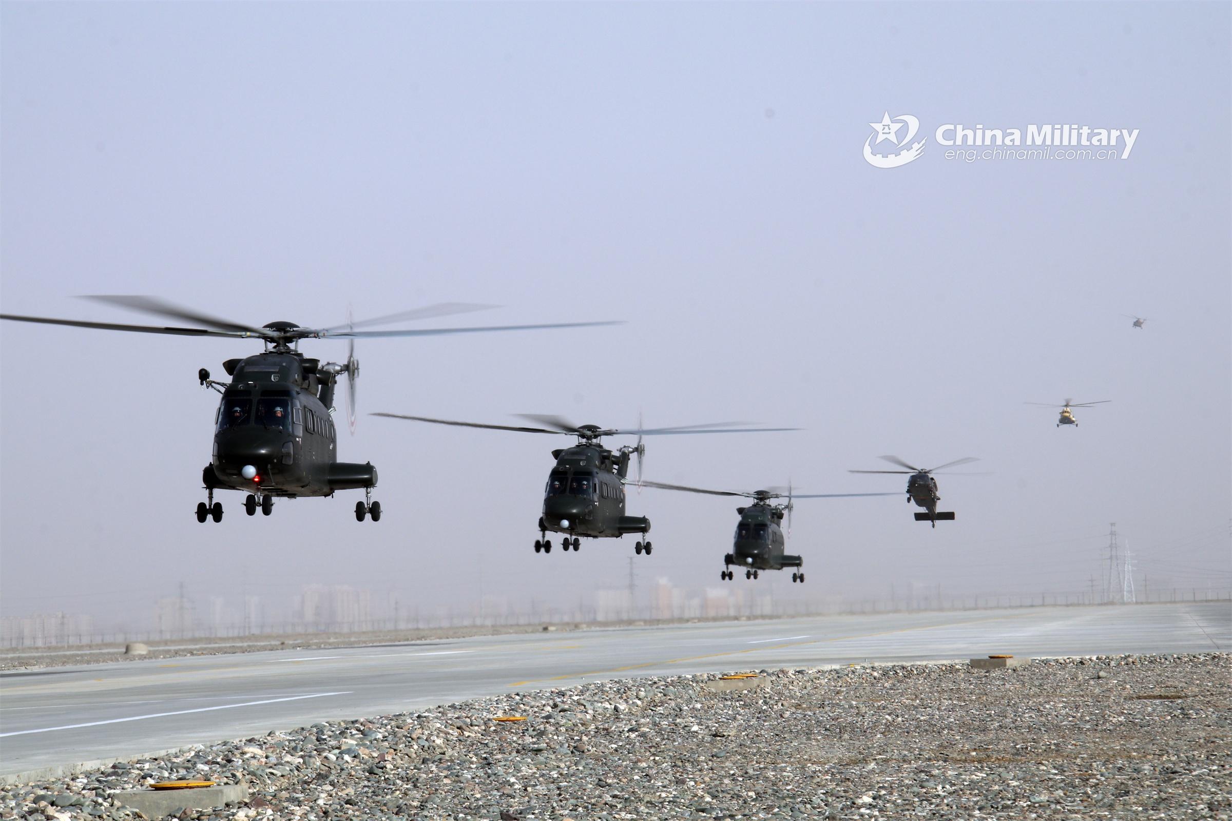Helicopters attached to an army aviation brigade under the PLA 76th Group Army conduct hover checks during a flight training exercise in early February, 2023. (eng.chinamil.com.cn/Photo by Yang Mingfu)