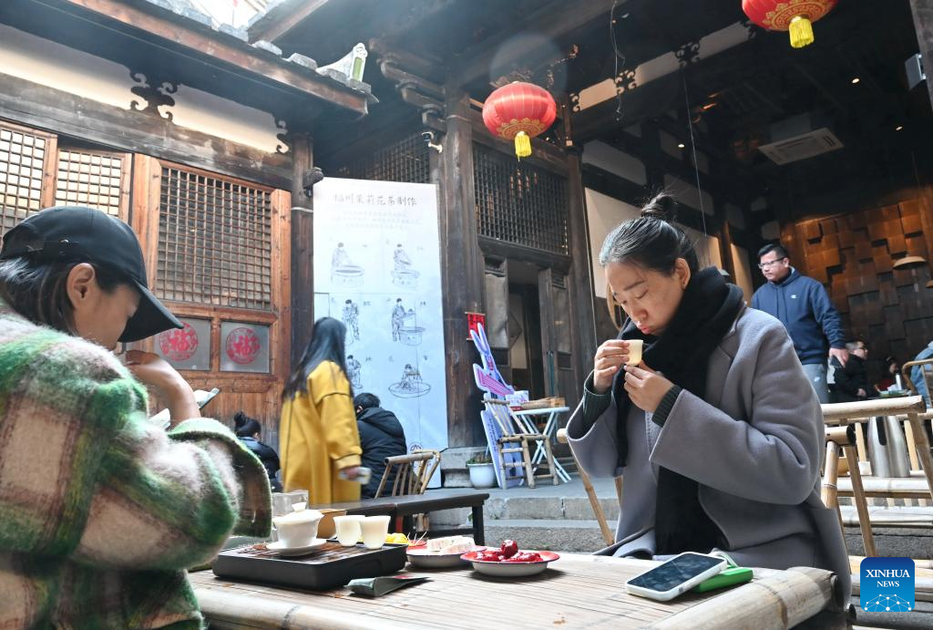 People drink tea in the Shangxiahang traditional block in Fuzhou, southeast China's Fujian Province, Feb. 26, 2023. The time-honored tea culture has contributed to the thriving of tea houses in Fuzhou. (Xinhua/Lin Shanchuan)
