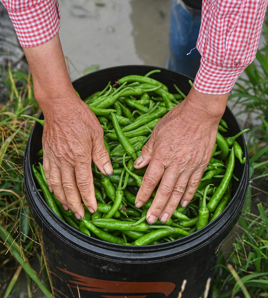 A farmer puts away freshly harvested green peppers in Poxin Township of Tunchang County, south China's Hainan Province, Feb. 14, 2023. (Xinhua/Pu Xiaoxu)