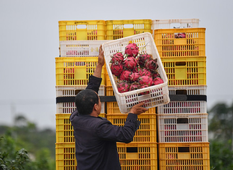 A farmer carries a basket of pitayas in Zhonghe Township of Danzhou, south China's Hainan Province, Feb. 24, 2023. (Xinhua/Pu Xiaoxu)
