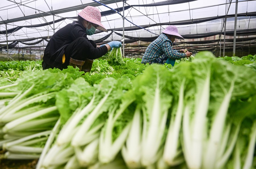 Farmers harvest vegetables in Poxin Township of Tunchang County, south China's Hainan Province, Feb. 14, 2023. (Xinhua/Pu Xiaoxu)