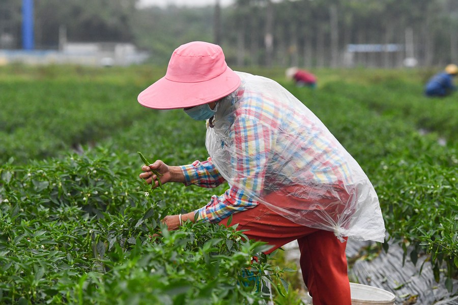 Farmers harvest green peppers in Poxin Township of Tunchang County, south China's Hainan Province, Feb. 14, 2023. (Xinhua/Pu Xiaoxu)