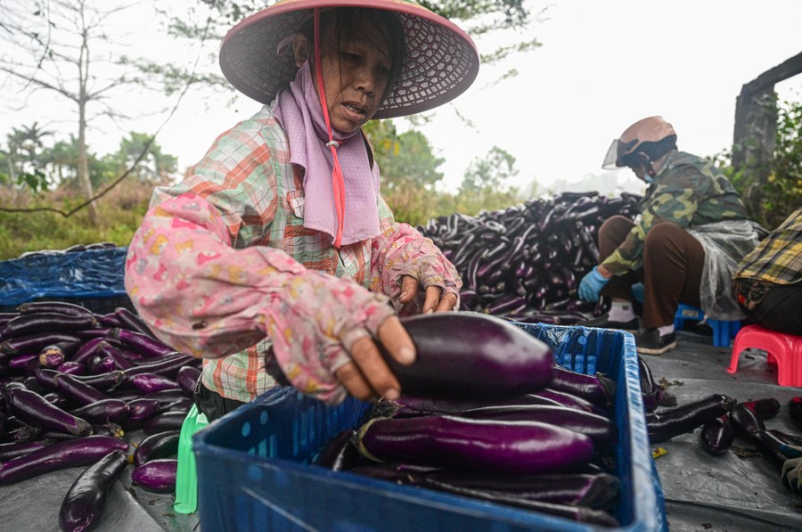 Farmers sort eggplants in Poxin Township of Tunchang County, south China's Hainan Province, Feb. 14, 2023. (Xinhua/Pu Xiaoxu)