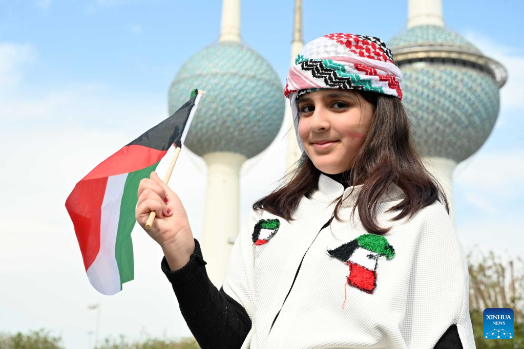 A girl poses for photos while attending a celebration of Kuwait's National and Liberation Days in Capital Governorate, Kuwait, Feb. 25, 2023. Celebrations were held to mark Kuwait's National and Liberation Days, which are observed annually on Feb. 25 and 26. (Photo by Asad/Xinhua)