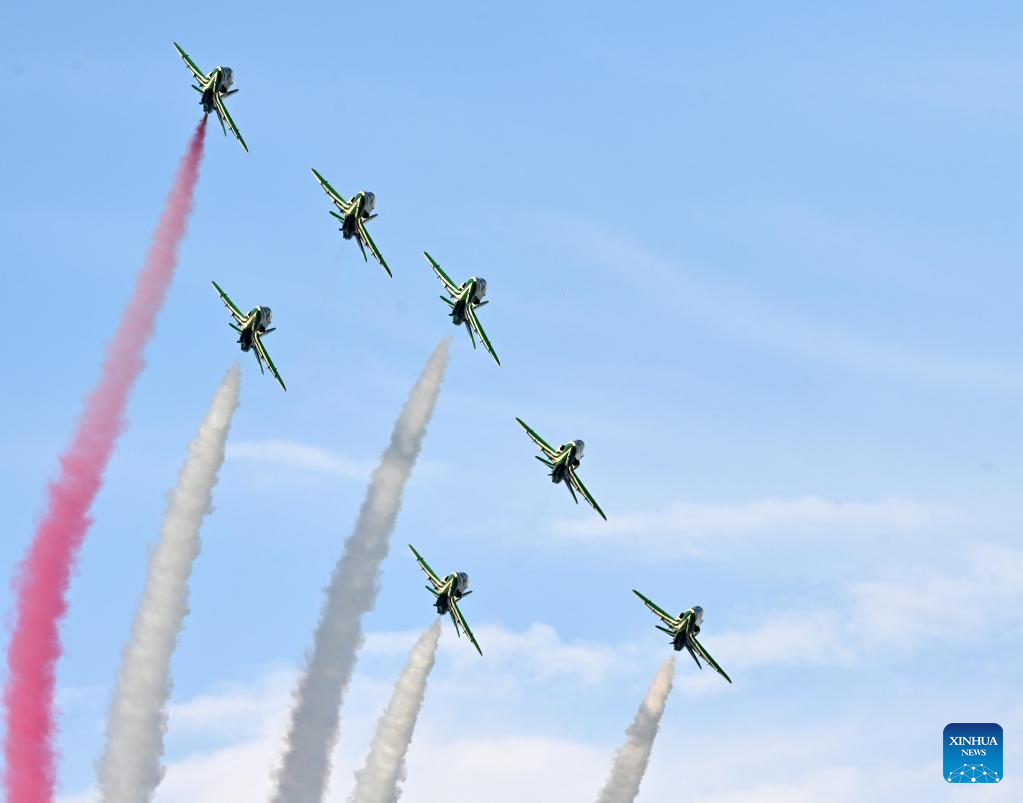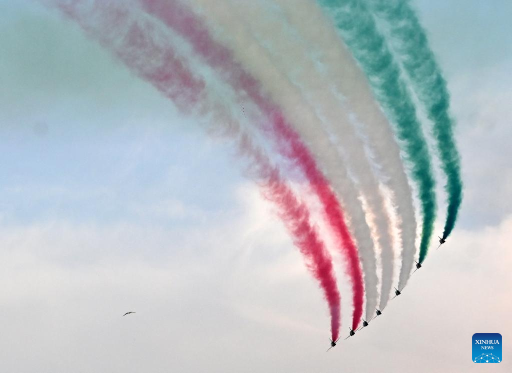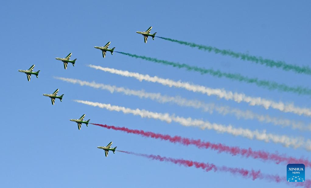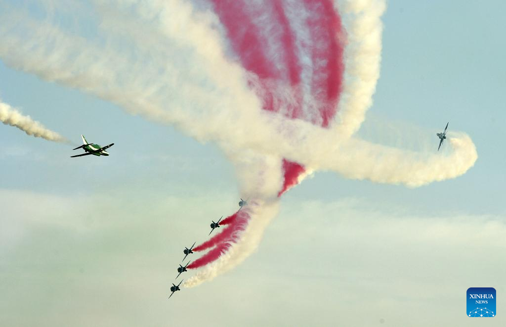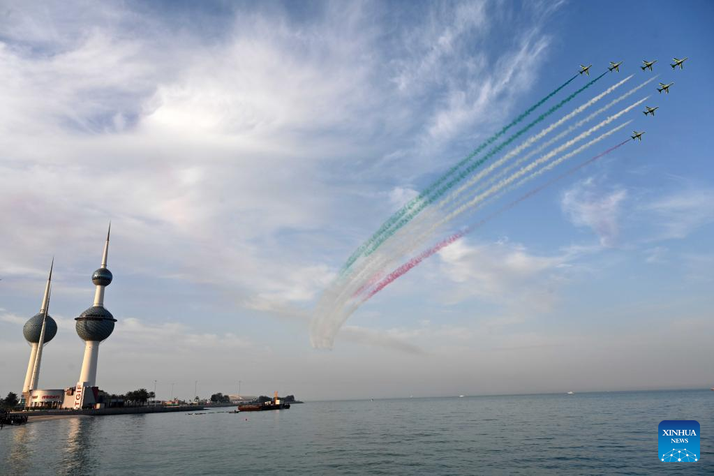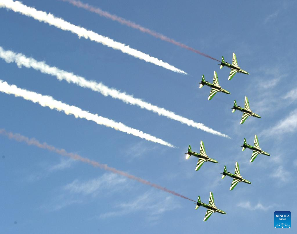 Saudi Hawks, the Royal Saudi Air Force aerobatic team, presents an air show in celebrations of Kuwait's National and Liberation Days in Capital Governorate, Kuwait, Feb. 25, 2023. Celebrations were held to mark Kuwait's National and Liberation Days, which are observed annually on Feb. 25 and 26. (Photo by Asad/Xinhua)